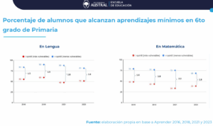 Según el Tercer Informe del Indicador de Desigualdad de Aprendizajes de la Universidad Austral, mientras en Lengua la brecha educativa entre los estudiantes más vulnerables y menos vulnerables se mantiene estable, en Matemática, por el contrario se ha profundizado. Esta situación se da en un contexto de caída sostenida en los niveles de aprendizaje. Apenas 5 de cada 100 estudiantes más vulnerables alcanzan los aprendizajes mínimos en esta materia. En primaria, la desigualdad es menor y se mantuvo relativamente estable en los últimos años.