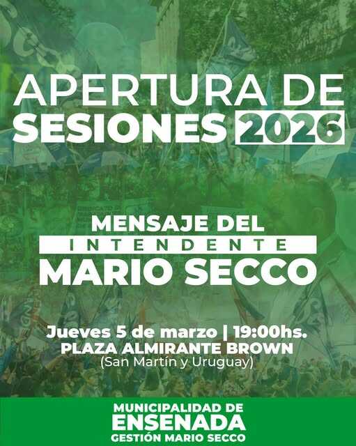 Este jueves 5 de marzo se realizrá la apertura de las sesiones ordinarias del año 2026 y el intendete Mario Secco quiere invitar a todos los ensenadenses a ser parte de este acto en el que daré un mensaje repasando la gestión que venimos realizando y los proyectos que tenemos.