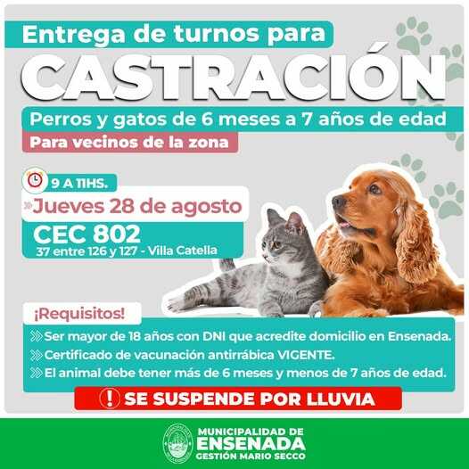 Reforzando las campañas de zoonosis en los barrios, estaremos entregando turnos para castración de perros y gatos de 6 meses a 7 años de edad para vecinos de la zona. Será este jueves de 9 a 11 hs. en el CEC N° 802 de Villa Catella, de calle 37 entre 126 y 127.