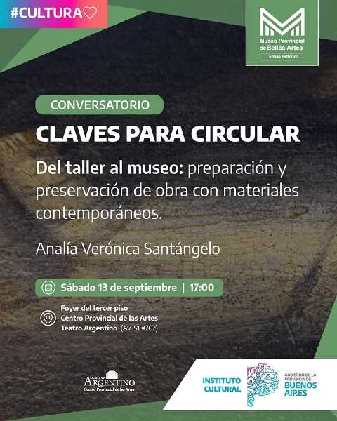 El Museo Provincial de Bellas Artes Emilio Pettoruti llevará a cabo el sábado 13 a las 17:00 la charla “Del taller al museo: preparación y preservación de obra con materiales contemporáneos”, a cargo de la profesora Analía Verónica Santángelo. Se desarrollará en el foyer del tercer piso del Centro Provincial de las Artes Teatro Argentino (Av 51 e/ 9 y 10 – La Plata). Esta actividad forma parte de la agenda del Instituto Cultural de la Provincia de Buenos Aires.
