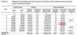 Finalmente, el organismo detalló que el coeficiente de Gini del ingreso per cápita familiar (donde el 0 representa la igualdad absoluta y el 1 equivale a la máxima desigualdad) se ubicó en 0,427 para el cierre del 2025, mostrando solo una leve variación respecto al 0,430 registrado en el mismo período del año anterior.