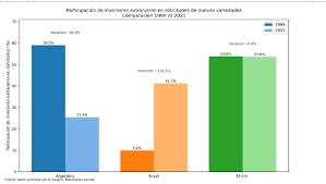 Entre 1999 y 2021, la participación de empresas extranjeras en solicitudes de nuevas variedades en Argentina cayó del 59% al 25,4%, una reducción superior al 56%. En el mismo período, Brasil pasó del 9,9% al 41,2%, y Estados Unidos (patentes) se mantuvo estable, cerca del 53%.
