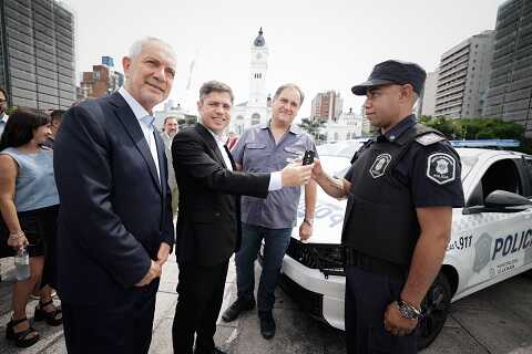 El gobernador de la provincia de Buenos Aires, Axel Kicillof, encabezó este viernes el acto de entrega de 40 nuevos móviles policiales para fortalecer la prevención del delito en la ciudad de La Plata. Fue junto al ministro de Seguridad, Javier Alonso; y el intendente local Julio Alak.