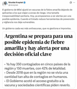 Desde agosto, cuando la gestión de Javier Milei anunció que la vacuna contra la fiebre amarilla dejaría de aplicarse de forma gratuita para personas que no residan en zonas consideradas endémicas, Kreplak alertó públicamente que esta medida significaba abandonar una política estratégica de salud pública.