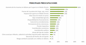 El informe advierte que el conflicto en Medio Oriente comienza a impactar de forma directa en la rentabilidad del sector: el 66% de los productores señala el aumento de los costos de los insumos como su principal preocupación, por encima de factores como el clima o los precios agrícolas. Este escenario ya incide en las decisiones productivas y podría traducirse en una menor siembra de trigo en la campaña 2026/27.
