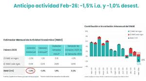 Por su parte, el Estimador Mensual de Actividad Económica (EMAE) de la consultora Equilibra también marcó un retroceso: -1% en la comparación mensual y -1,5% interanual. Según el informe, la caída se explica en parte por factores estacionales, como la menor cantidad de días hábiles debido a los feriados de carnaval, aunque no alcanza para justificar por completo la desaceleración.