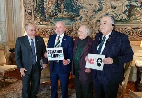 El encuentro tuvo lugar en la residencia del embajador de Brasil, en la previa a que Lula regrese a Brasil. En la foto que se sacaron el mandatario del país vecino, Pérez Esquivel y el diputado Eduardo Valdés, se puede ver a Lula con un cartel que dice «Cristina libre».