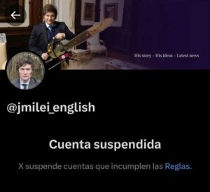 Luego de cinco horas activa, X suspendió la cuenta @JMilei_English por infringir las normas de la comunidad. Algunas de las faltas que conllevan esta sanción son el ciberacoso, los discursos de odio, la proliferación de noticias falsas y compartir contenido multimedia «delicado».