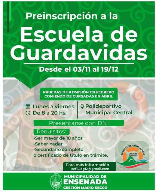 Ensenada es una de las pocas ciudades del país que cuenta con una Escuela de Guardavidas pública. Preinscripción, solo con DNI desde el 03/11 al 19/12, lunes a viernes de 8 a 20 hs., Polideportivo Municipal.