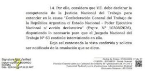 El dictamen fue firmado por el fiscal general ante la Cámara Contencioso Administrativo Federal, Rodrigo Cuesta, en el marco del conflicto de competencia abierto tras la sanción de la Ley 27.802. Allí, la CGT cuestiona la constitucionalidad de más de 80 artículos que modifican aspectos centrales del régimen laboral vigente.