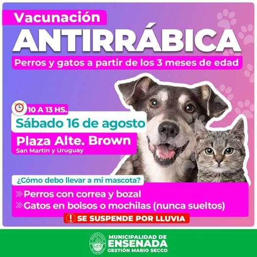 La Municipalidad continúa con las campañas de zoonosis en los barrios de las tres localidades: en esta ocasión, para reforzar la vacunación antirrábica, se realizará una jornada este sábado de 10 a 13 hs. en la Plaza Almirante Brown, calle San Martín y Uruguay.