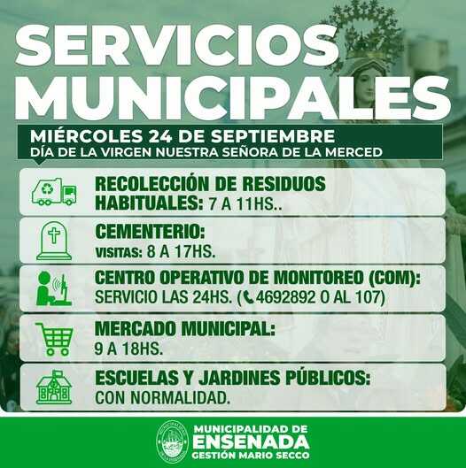 Se informa el funcionamiento de los servicios municipales durante el miércoles 24 de septiembre, Día de la Patrona de Ensenada Virgen Nuestra Señora de La Merced.