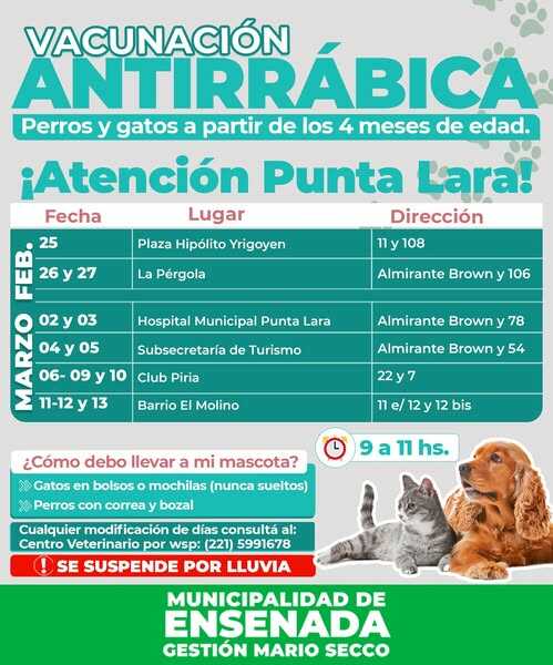 Se continúa con la vacunación antirrábica gratuita para perros y gatos en la localidad de Punta Lara. El horario de atención en todas las sedes es de 9 a 11hs.