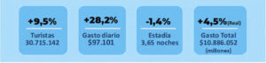 l La cantidad de personas que viajaron en toda la temporada creció 9,5% frente a la temporada 2025, mientras que el gasto total real aumentó 4,5%, impulsado específicamente por la mayor cantidad de personas que pernoctaron al menos una noche fuera de su ciudad.